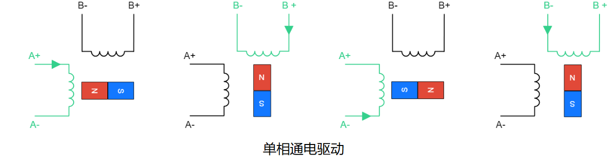 顾名思义,就是每走一步都是取整的意思。而在整步控制上,也可分成单相通电驱动和双相通电驱动: