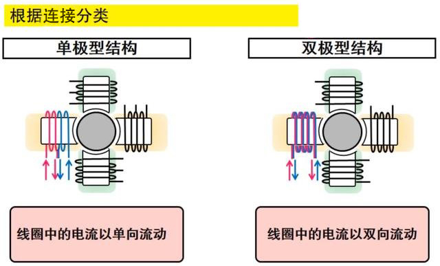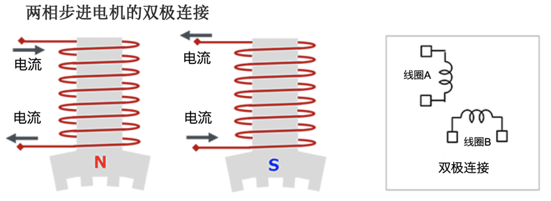 双极型:采用电流在一个绕组中双向流动的驱动方式(双极驱动)。这种方式电机的结构比较简单,端子数也较少,但由于必须控制一个端子的极性,因此驱动电路较为复杂。