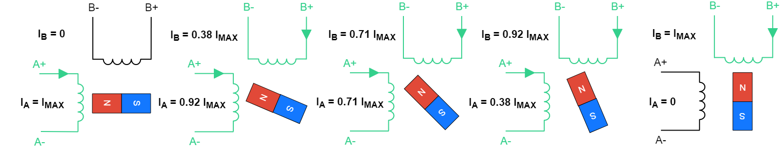 在微步模式下,可以看作是半步模式的增强版,因为它可以进一步减小步距,并且具有恒定的扭矩输出。这是通过控制每相流过的电流强度来实现的。最多可将电机步距角细分 256 倍,提高了低速光滑度和低速谐振效果。