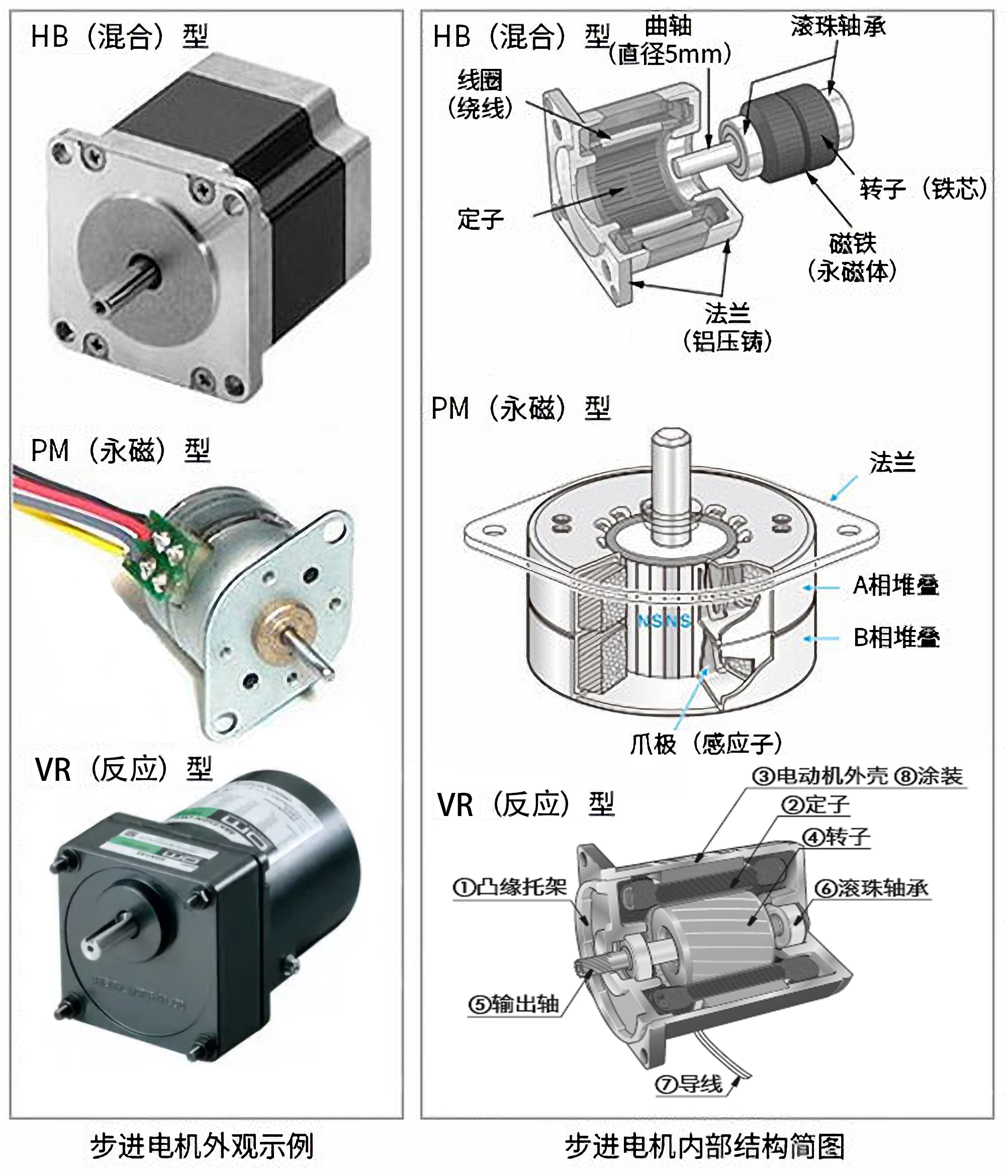 步进电机在构造上有三种主要类型:反应式(Variable Reluctance, VR)、永磁式(Permanent Magnet, PM)和混合式(Hybrid Stepping, HS)